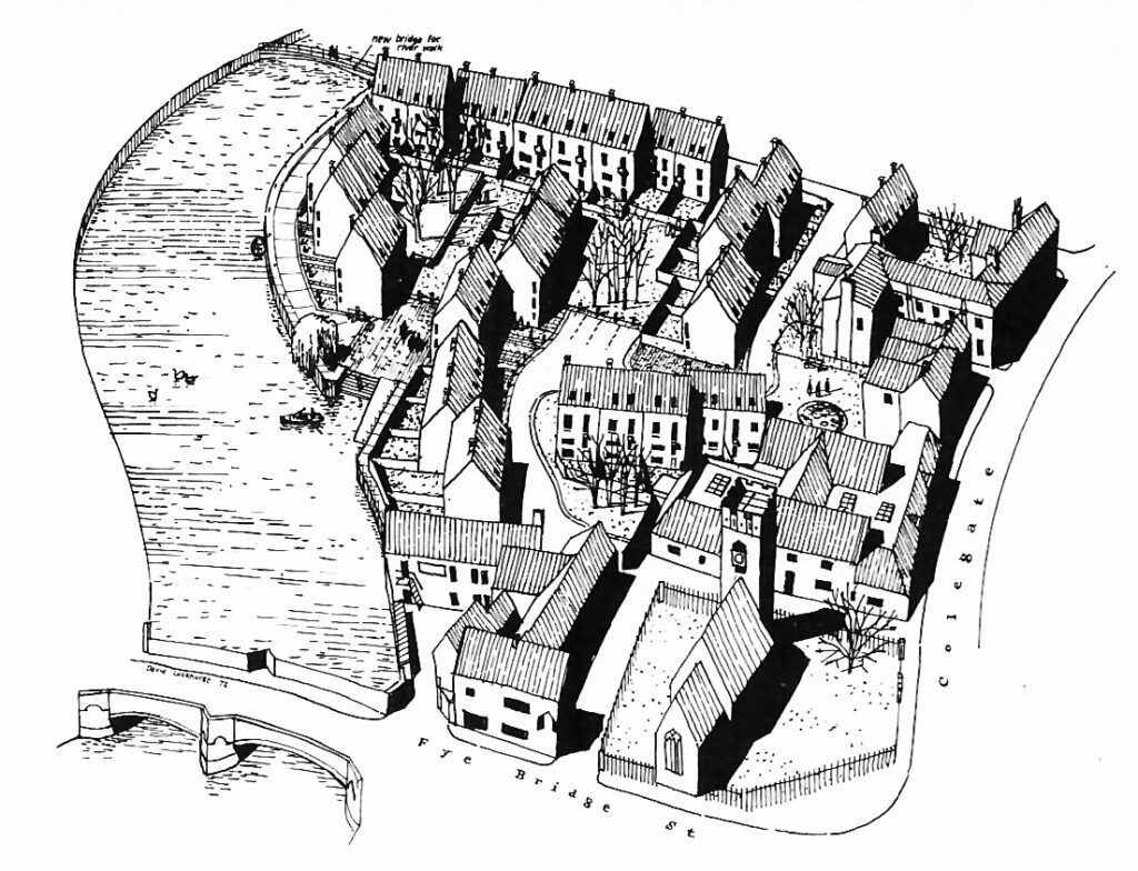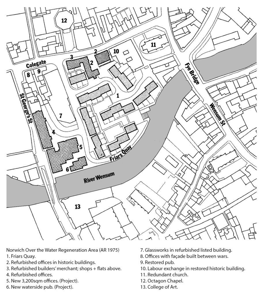 A recent tourism marketing campaign by Visit Norwich called ‘Old City, New Attitude’ features a view along the leafy River Wensum in the heart of the city. On the left bank are Quayside and the Ribs of Beef pub. Beyond Fye Bridge, on the right bank, is the gable of a short terrace of ancient houses backing onto St Clement’s churchyard and The Mischief Tavern, both hidden by the willow trees. In the background, the steeply pitched roofscape of Friars Quay nestles comfortably into the skyline to complete the scene. Friars Quay is a relatively new addition to this view, but it’s older than it looks. On closer inspection you might be forgiven for thinking it dates from the early C21st, inspired perhaps by the forward-thinking Dutch ‘Vinex’ housing programme which influenced so many UK housing-architects during the early 2000s… but this year Friars Quay celebrates its 50th birthday; it was completed in 1975.