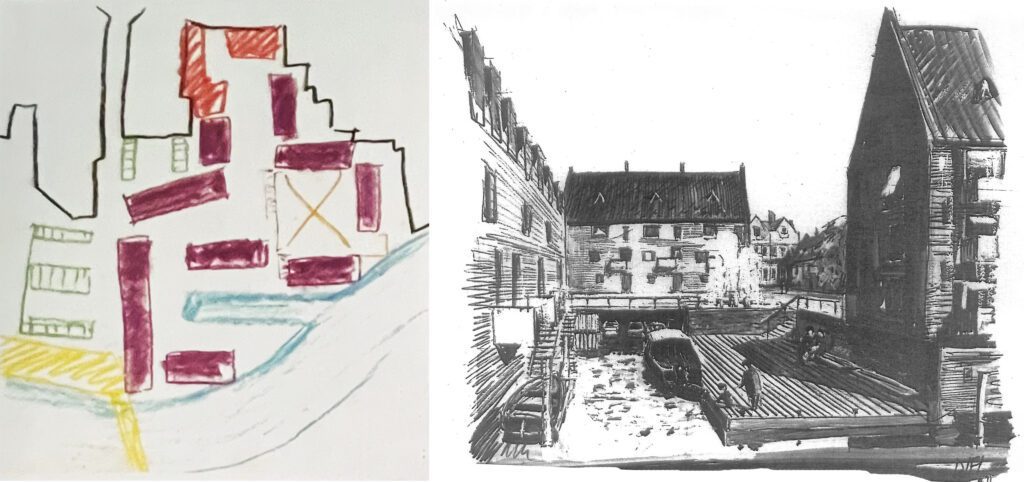 Over the course of this anniversary year we have renewed connections with Friars Quay’s very active residents’ association (of which, more later) and spent time with with F+M project architect David Luckhurst, now in his 90s but still spritely, engaged and happy to ‘talk shop’. On a walking tour of Friars Quay this summer I asked him where he got the ideas for the project. He replied (with a twinkle in his eye) ‘it came to me in a dream’, and waved a coloured crayon sketch at me. I arranged a follow-up session with him for further interrogation.