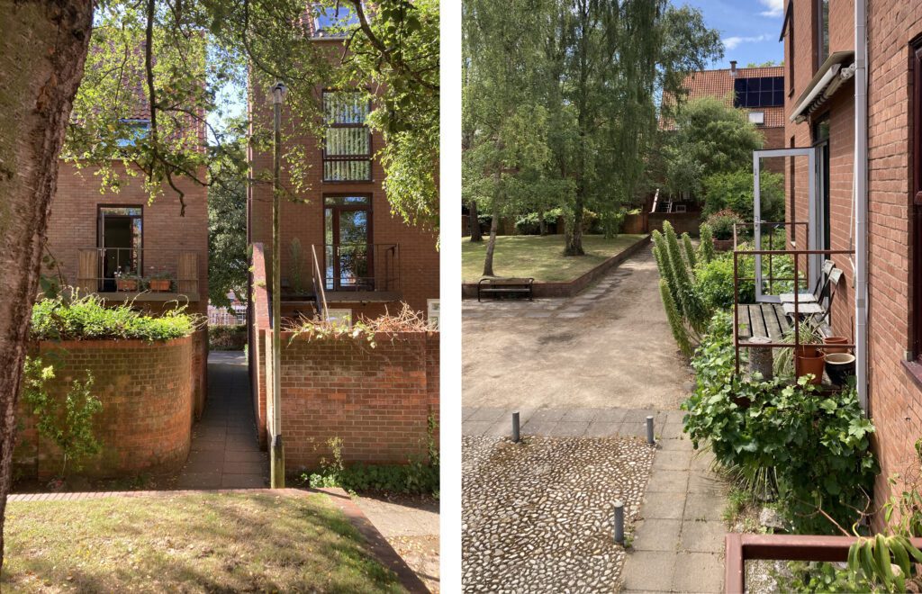 (Left) Pedestrian alley connecting west to St Georges Green. (Right) View from first floor living room balcony.