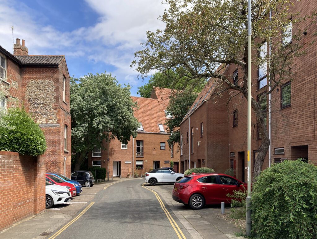 Access for vehicles is from a single point on Colegate, so the site is essentially a large cul-de-sac. The road passes down the west side of the site adjacent to St Georges Green, and then sweeps around onto the quayside. A side-road gives access to the northern part of the site, and the arrangement leaves the two courtyards at the heart of the development free of cars. Each house was originally marketed with a single parking space, either on-street or in one of 22 integral garages. Pedestrian routes into and across the site are more numerous than the trafficked roads, and include a number of narrow alleyways connecting directly to St Georges Green, Colegate and Fye Bridge Street.